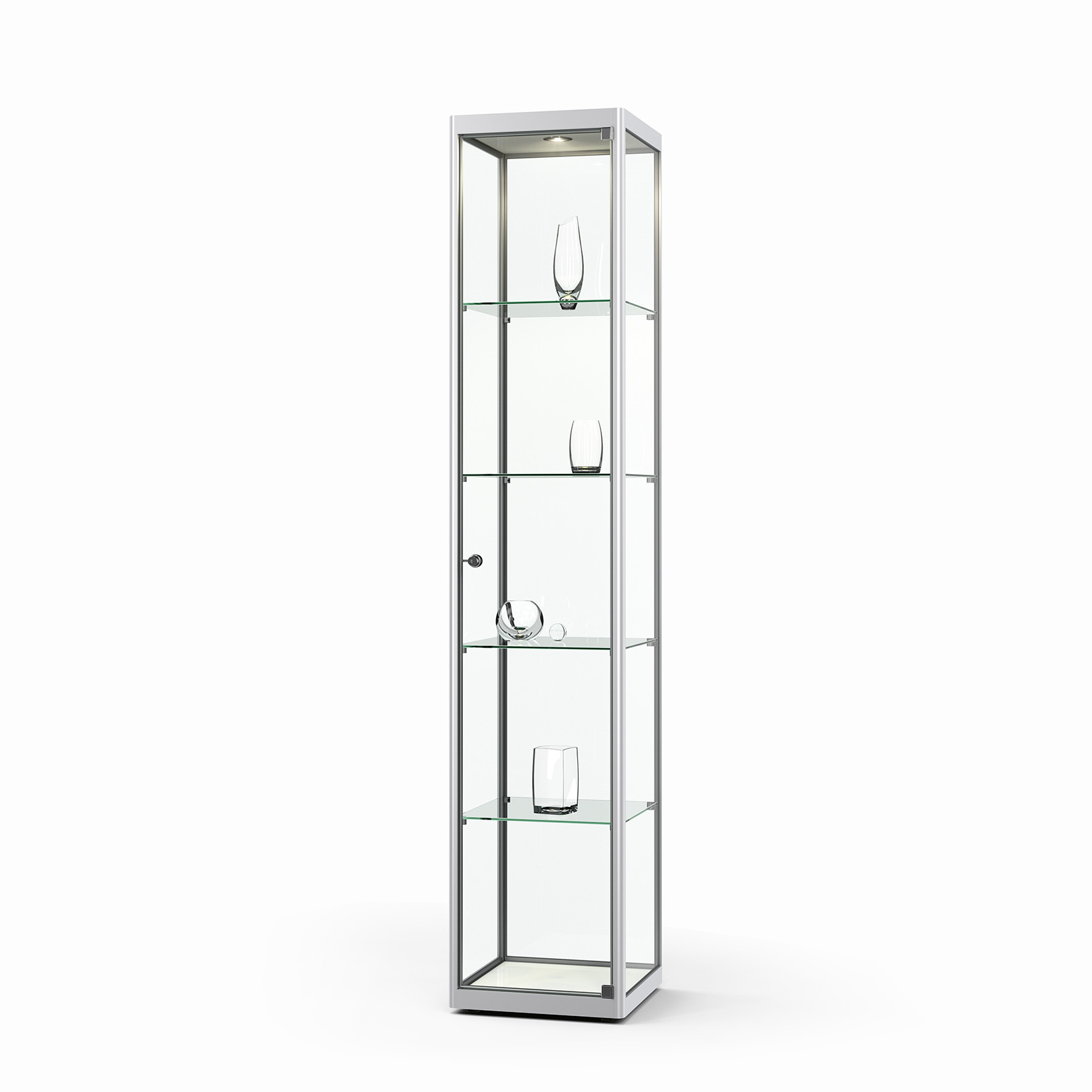 Säulenvitrine Ganzglas mit Deckel - Design-Vitrine für Museen, Ausstellungen oder das exklusive Büro Rahmenlose Ganzglas-Vitrine mit ESG-SicherheitsglasInkl. 3 Glasfachböden, an senkrechten Edelstahl-Stangen stufenlos höhenverstellbarOptionale Beleuchtung mit LED-Strahlern in der Vitrine Größen B/H/T500 × 1900 × 500 mm600 × 1900 × 600 mmSonderanfertigung auf Anfrage Oberfläche - Standard: Sockel/Deckel wahlweise in schwarz, weiß oder hellgrauOptional (gegen Aufpreis): Lackierung in RAL-Farbton nach WahlBeleuchtung - Ohne Beleuchtung – Beleuchtung mit 1 LED-Strahlern, in Deckenbereich integriert - Optional Set mit 4 oder 8 LED-Strahlern in Niedervolt-Technik, anschlussfertig inkl. Trafo an senkrechter Edelstahlstange3 Glasböden inklusive, stufenlos höhenverstellbar.Max. Belastbarkeit ca. 15 kg je Fachboden bei gleichmäßiger LastverteilungVerglasung - ESG-Sicherheitsglas bei allen außen liegenden GlasflächenÖffnung - Ganzglas-Drehtür mit Drehbändern, nach rechts öffnendSchließung - Sicherheitsschloss im unteren Bereich der Tür
