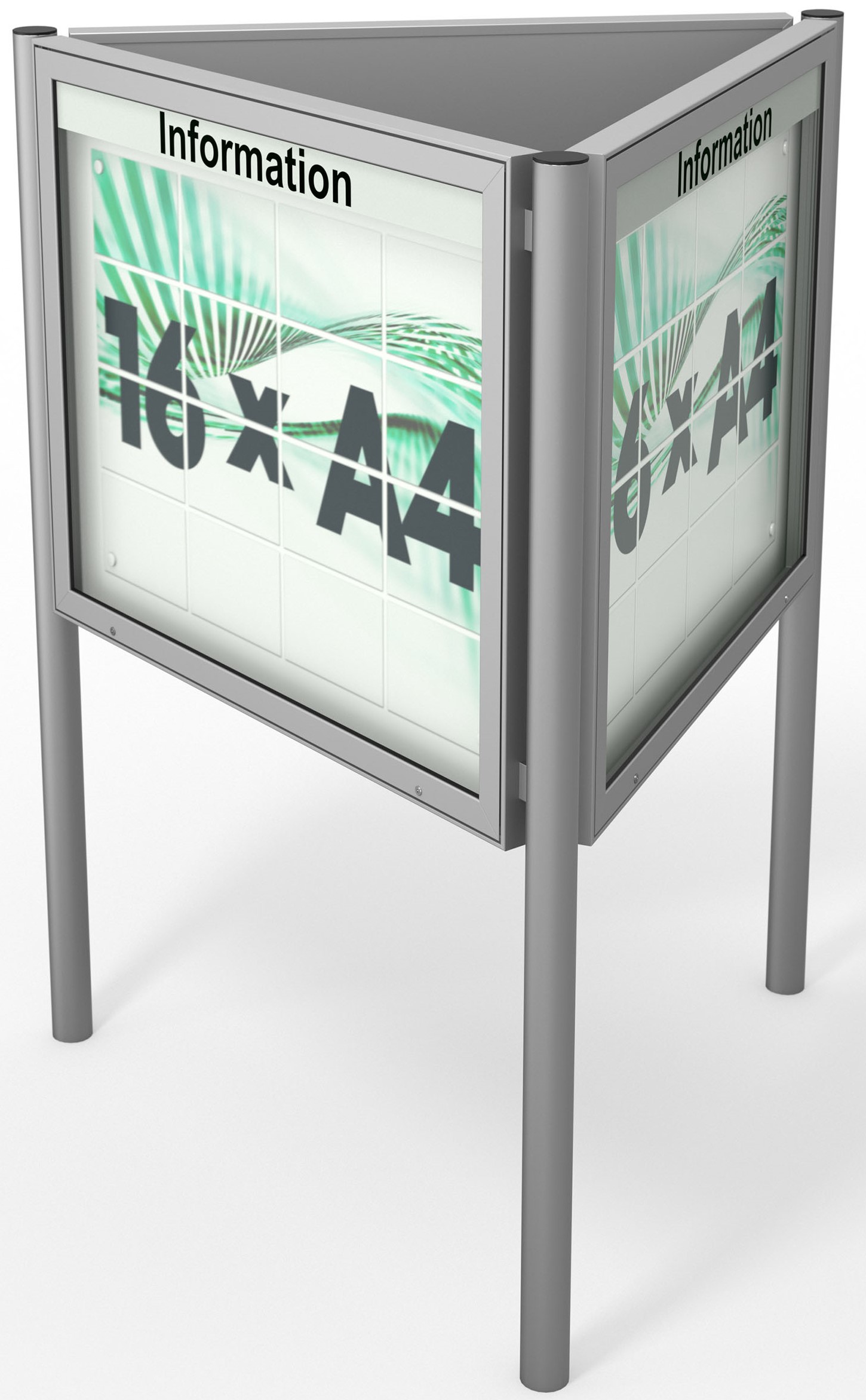 Merkmale Schaukasten: | Klappflügel, LED-Beleuchtung, abschliessbar, magnetisch, mit Pfosten, mit Standbeinen, wetterfest |