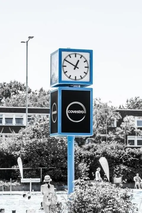 Stadtuhr mit Werbeschaukasten Digitalanzeige (Temperatur) Ziffernhöhe von 100 mm , 4-stellig, Ableseentfernung ca. 50m, Ziffernfarbe ist gelb 7-Segment LCD-Anzeige für den Außenbereich Hervorragende Ablesbarkeit (bei direkter Sonne oder Dunkelheit im Blickwinkel von +/-70°) Temperaturbereich von -30 bis+90 °C Extrem niedriger Energiebedarf, keine Geräuschbildung und keine Verschleißteile Analoguhr Ziffernblatt aus schlagzähem, weißen Acrylglas mit Stundenbalken bedruckt, im Durchmesser von 500 mm revisionsfreundlich befestigt und vollflächig hinterleuchtet Hochwertiges Uhrwerk mit Stunden- und Minutenimpuls (Impulsanpassung 12 oder 24 Volt) Netzbetriebene Funkuhr für den Außenbereich, vollautomatische Zeigereinstellung Automatische Umstellung von Winter- auf Sommerzeit Werbekorpus Sichtfläche 585 x 1680 mm Monosockel für eine einfache Montage ausgelegt