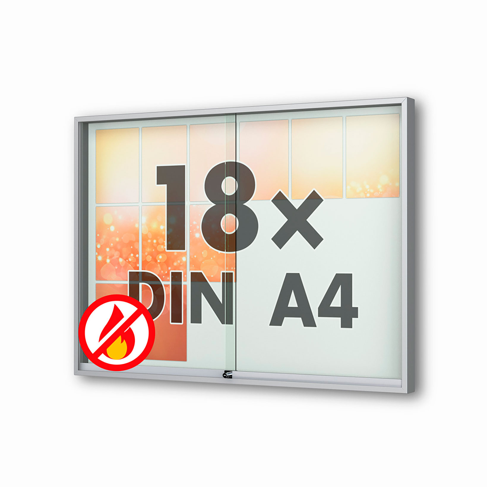 Schaukasten Fortis - eckig - mit Schiebetüren -210 mm Gehäusetiefe, rollengelagerte Schiebetüren, höchster Brandschutz (A1) Größe - 18 × DIN A4 • 1370 × 1010 mmSichtfläche: 1330 x 950 mm Öffnung - rollengelagerte SchiebetürenVerglasung - Einscheiben-Sicherheitsglas / ESGOberfläche - Eloxierung in matt-silber (E6/EV1)Beleuchtung - ohne BeleuchtungSchließung - Sicherheitsschlösser mit je 2 SchlüsselnRückwand - weiße, magnethaftende Rückwand inkl. 10 Magnete