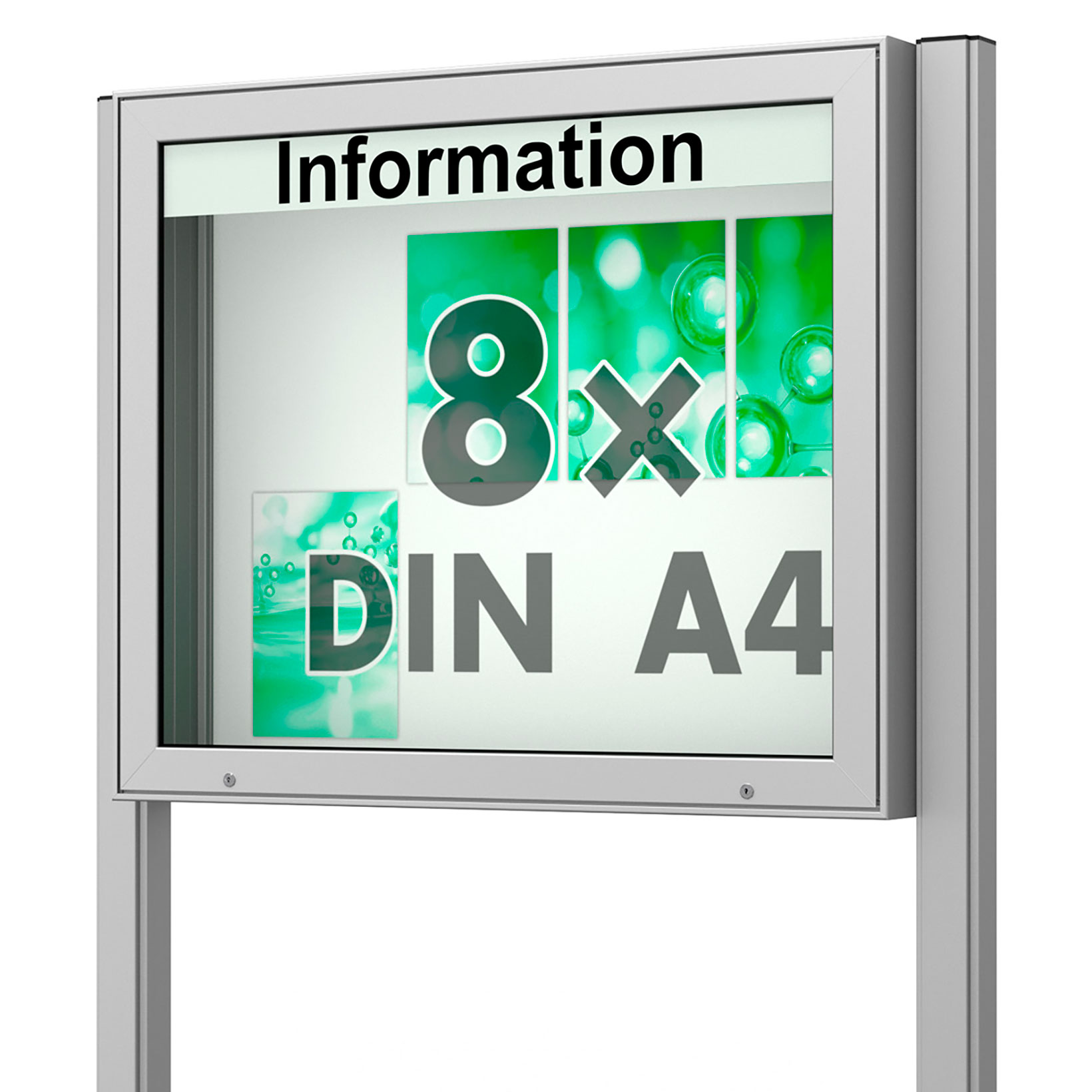 8 x DIN A4 Schaukasten Plenum eckig - der "Klassiker" mit Solar-Modul und Pfosten - Bautiefe 210mm